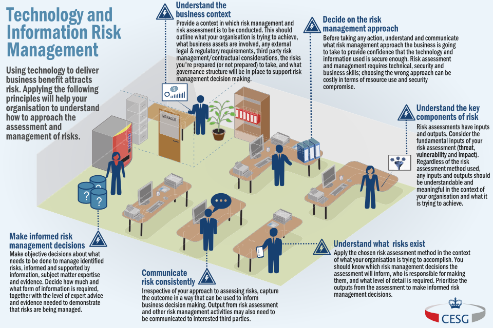 Using technology to deliver business benefit attracts risk. Applying the principles described below will help organisations to understand how to approach the assessment and management of risks.