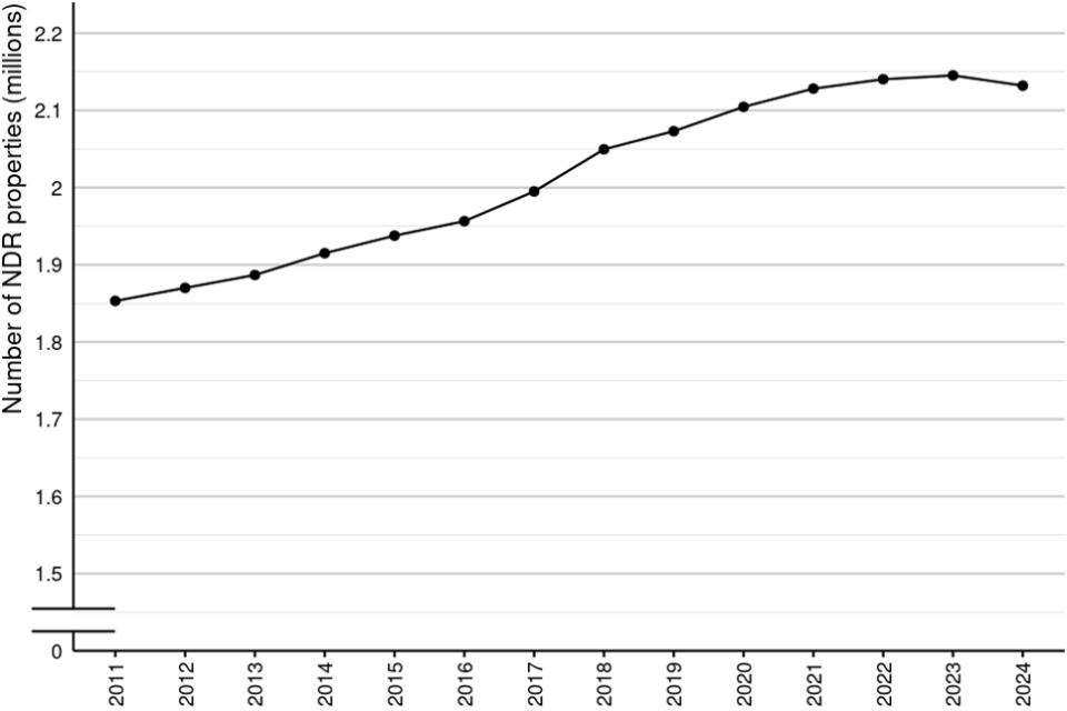 The stock of properties at 31 March 2024 was 2.13 million, down from 2.15 million at 1 April 2023 (the start of the 2023 rating list).