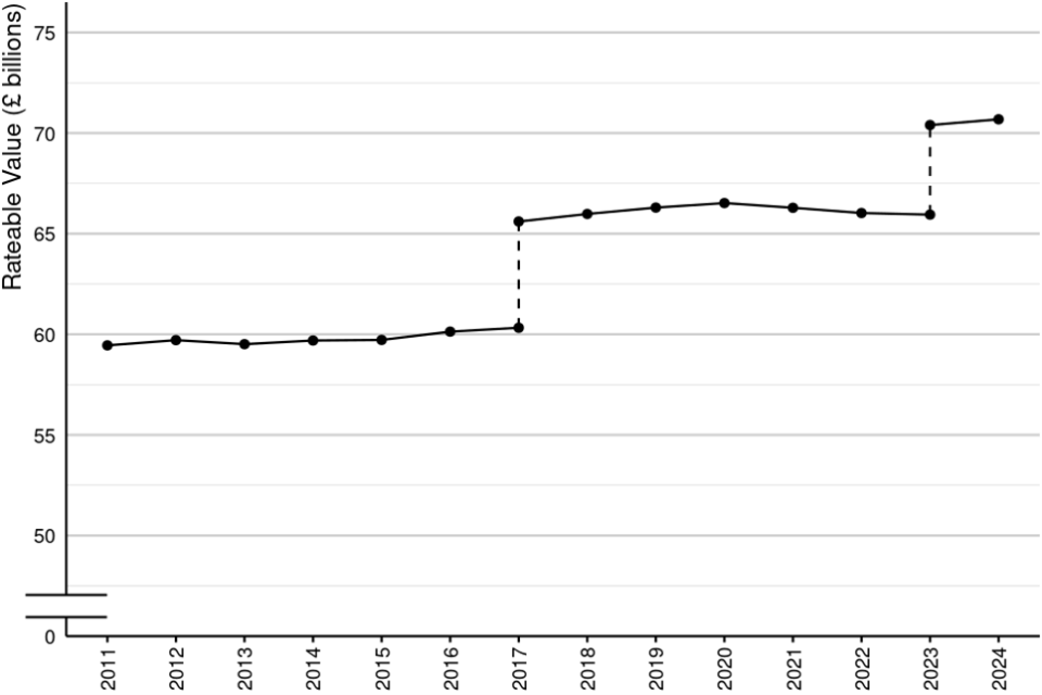 Figure 4 shows total RV in England and Wales at 31 March of each year from 2011 to 2024. Each dotted line coincides with the end of a revaluation cycle and the introduction of a new Rating List. Between 31 March 2023 and 31 March 2024 (the end of the 2017 list), RV increased from £65.9 billion by £4.7 billion (7%). Since 1 April 2023 (the start of the 2023 Rating List), total RV has increased by £0.3 billion from £70.4 billion to £70.7 billion. A breakdown of the change to rateable value since the start of the 2023 rating list can been see in figure 2.