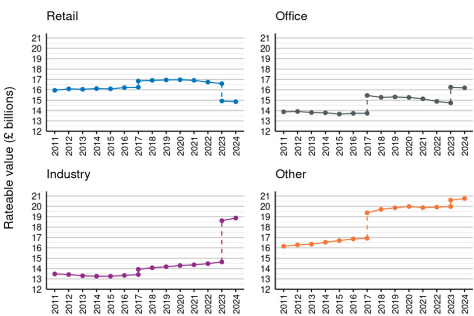 Figure 6 shows total RV in each sector in England and Wales at 31 March of each year from 2011 to 2024. Each dotted line coincides with the end of a revaluation cycle and the introduction of a new Rating List. Since 31 March 2018 (the first full year of the 2017 Rating List):