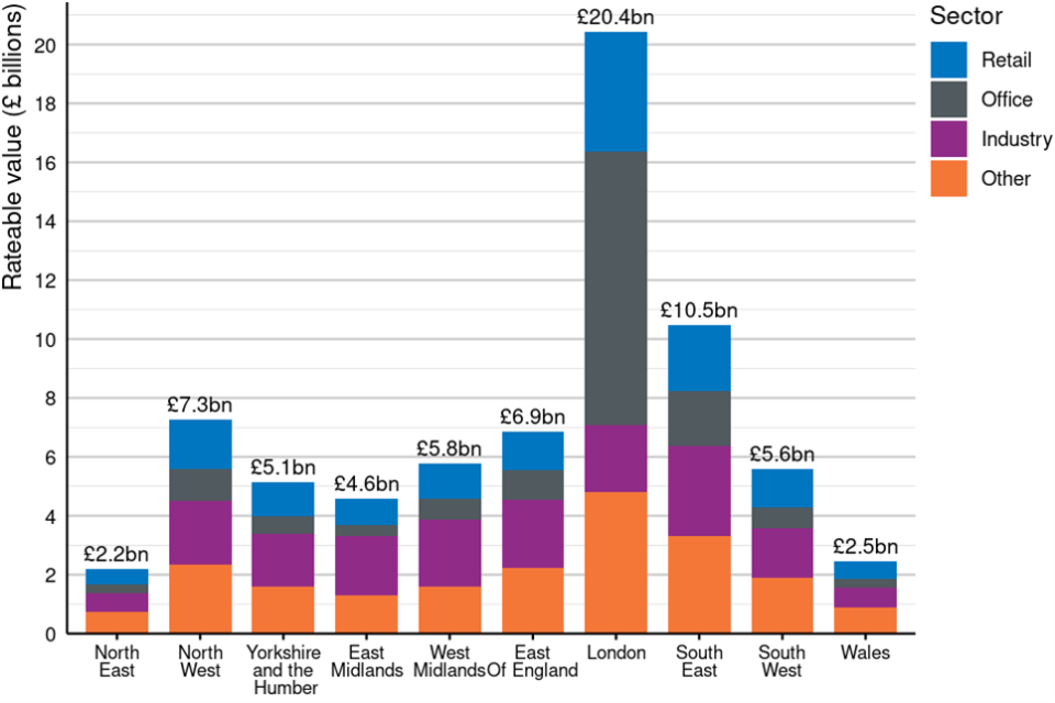 Figure 10: Total rateable value by region and sector