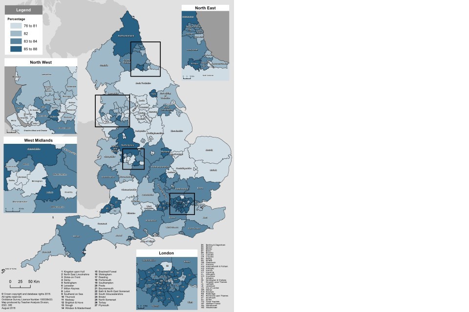 Figure 7 shows the variation in the percentage of pupils who met the expected standard in phonics between local authorities in England.