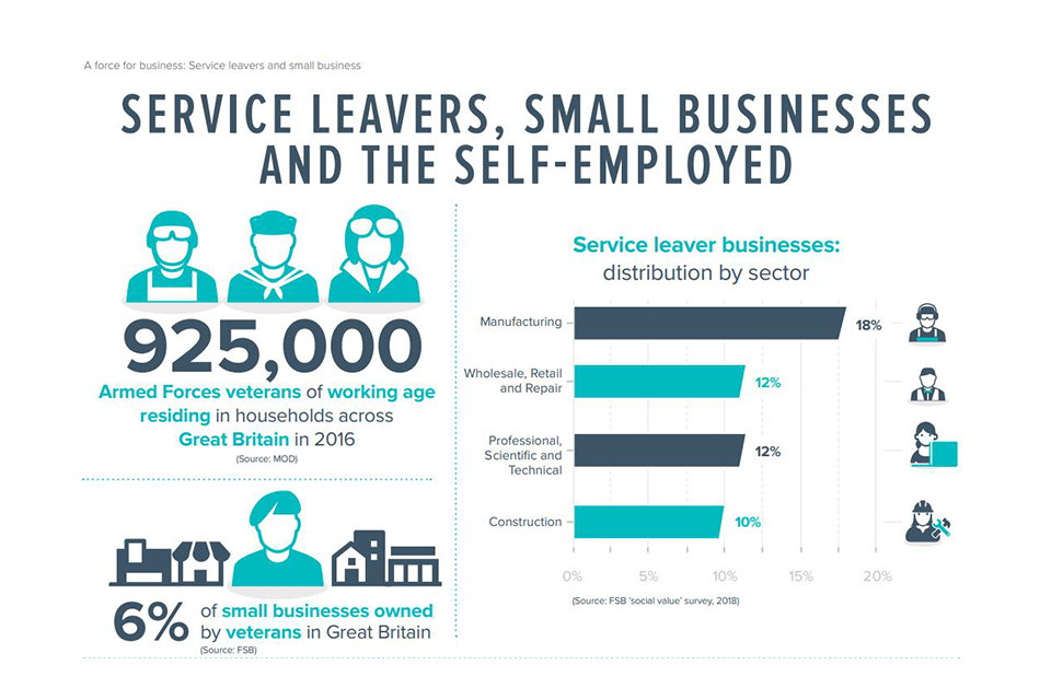 info graphic with stats for service leavers, it shows there are 925,000 veterans of working age in the UK in 2016, and that 6% of small businesses are owned by veterans.