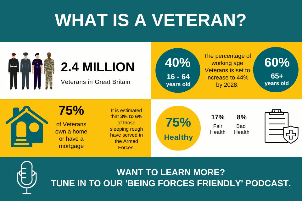 There are 2.4 million veterans in Great Britain. 40% of veterans are 16-64 years old. The percentage of working age veterans is set to increase to 44% by 2028. 60% of veterans are over 65. 75% of veterans own their home or have a mortgage. It is estimated that 3% to 6% of those sleeping rough have served in the Armed Forces. 75% are healthy, 17% have fair health and 8% have bad health. Want to learn more? Tune in to our ‘being forces friendly’ podcast’.
