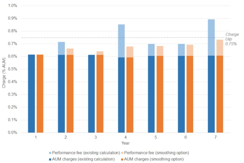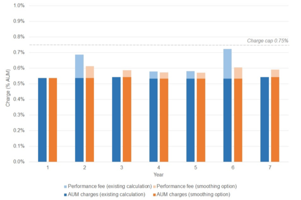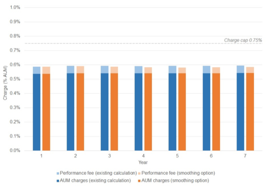 26. Rather than the performance fees occurred in a single year forming part of that year’s charges regime, schemes could instead use a moving average in its place, spanning across multiple years. This would mean that for some years where schemes may happen to exceed the 0.75% charge cap because performance is good, they would not be penalised for doing so, so long as at the end of that multi-year period the average charge to members was within the charge cap limit. The proposal was originally proposed by the British Business Bank and Oliver Wyman in their 2019 report[footnote 7].