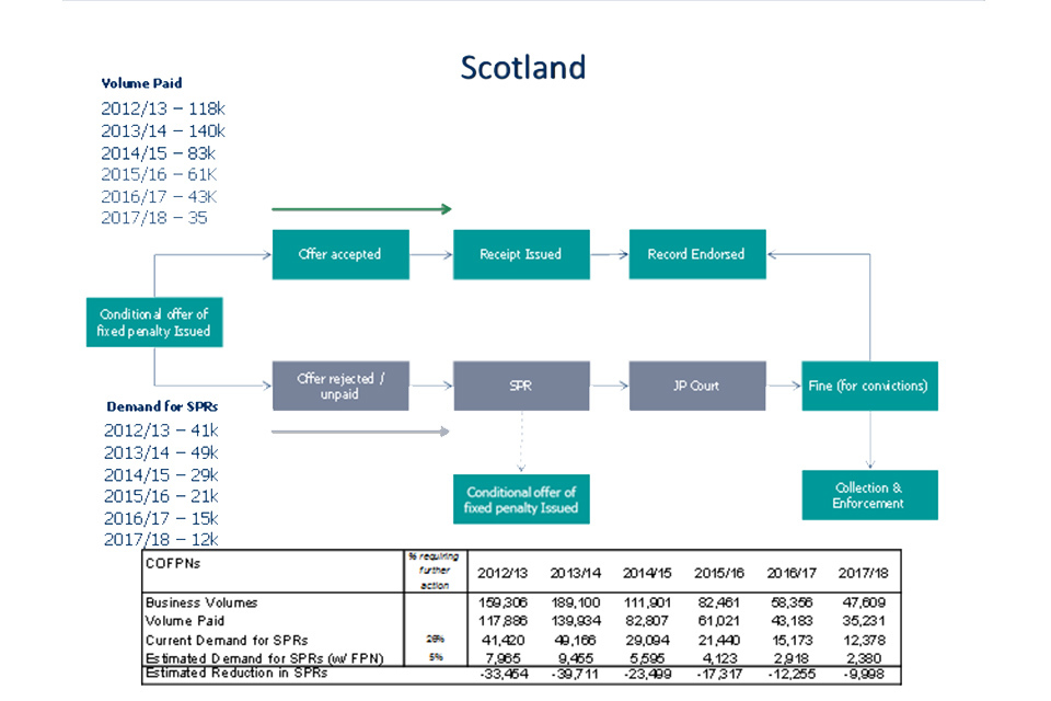 - the Scottish Government: impact assessment – some respondents called for an impact assessment considering the projected effects in more detail. Consequently, in the factual summary of consultation responses, the Scottish Government gave an undertaking to assess potential costs and savings of FPN reform. This detailed costing work can be seen in the technical annex