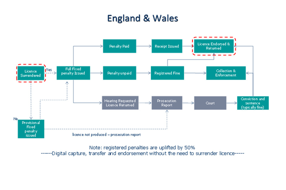 The diagram below details the process in England and Wales when a full fixed penalty has been issued, and the 3 potential subsequent scenarios. The scenarios are: