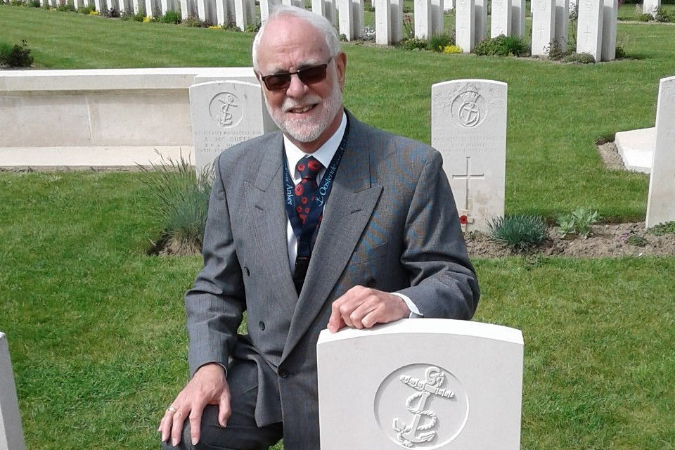 David Slade kneels beside the newly marked headstone for PO McDonald, Crown Copyright, All rights reserved