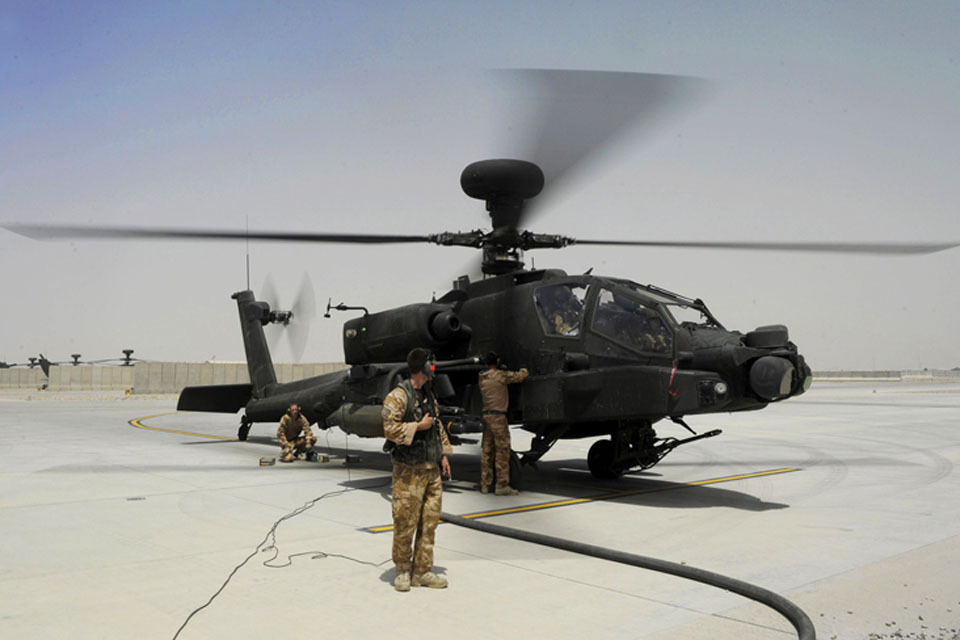 Ground crew check over a British Army Apache attack helicopter prior to take-off at Camp Bastion in Helmand province [Picture: Sergeant Alison Baskerville, Crown Copyright/MOD 2011]