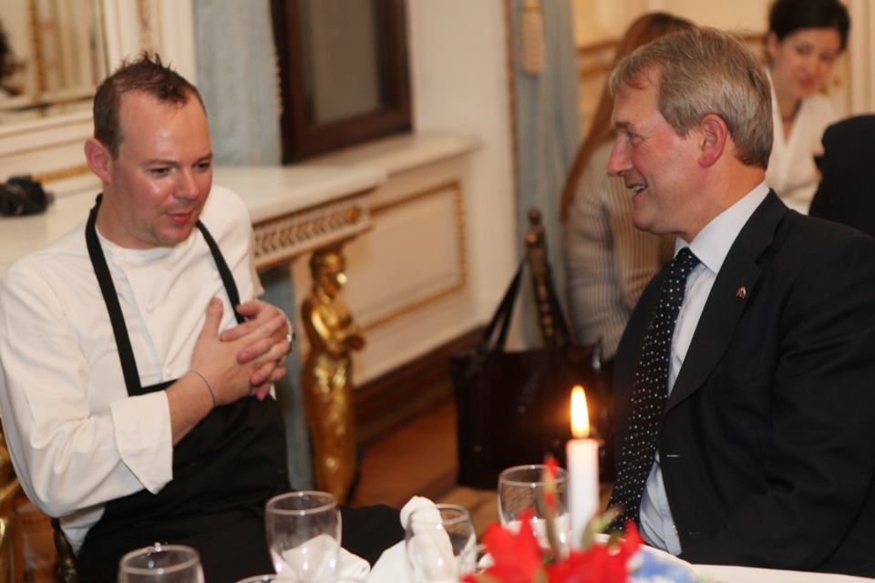 British chef Daniel Phippard of Moscow’s Yornik restaurant prepared a sumptuous dinner of Scottish salmon and Dorset lamb to mark the event which it is hoped will encourage an increased market here for the produce. Taking a bow from appreciative diners, he too praised the extremely high quality of the product.