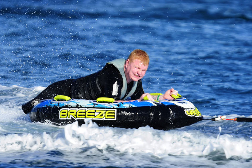 Ranger Andy Allen takes a turn on the 'doughnut', being pulled behind a rigid-hulled inflatable boat, during an afternoon in the Bay of Gibraltar [Picture: Corporal Ralph Merry ABIPP RAF, Crown Copyright/MOD 2011]