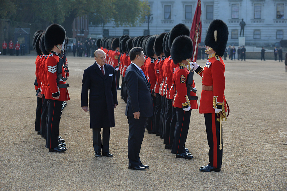英国女王、(爱丁堡公爵)菲利普亲王、(康沃尔公爵和夫人)威尔士亲王查尔斯王储和夫人、英国首相、内阁高级成员、伦敦金融城市长、伦敦市市长和高级军事将领一同出席了欢迎习近平主席和夫人彭丽媛的仪式。另有1100余名士兵和230余匹军马参与到欢迎仪式中。