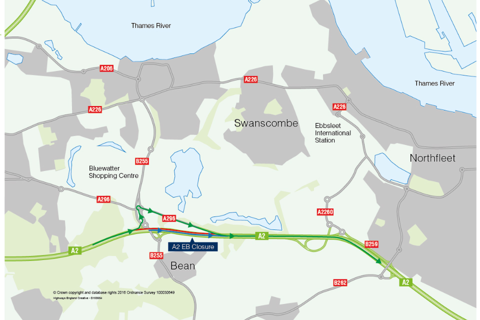 The coastbound A2 will be closed between the exit and entry slip roads at the Bean junction and a clearly signed diversion will be in place via the slip roads.