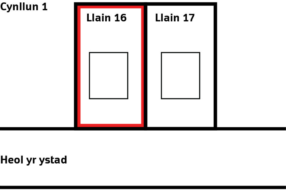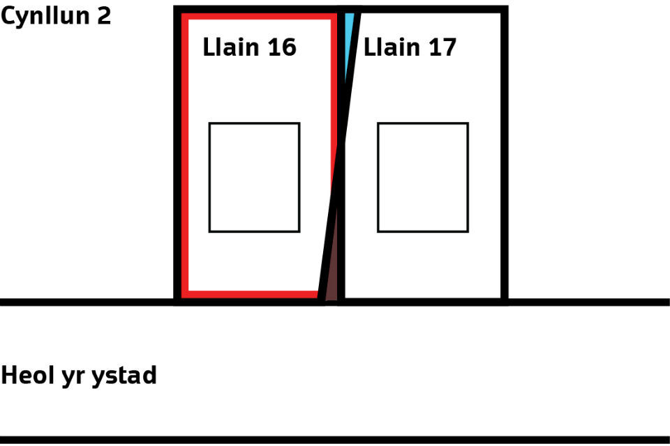 Ar ôl cofrestru’r trosglwyddiad sylwir bod is-gontractwr ffensio’r datblygwr wedi codi ffens sy’n gwahanu llain 16 o lain 17 ar y tir mewn safle gwahanol i’r safle bwriadedig (gweler cynllun 2 isod).