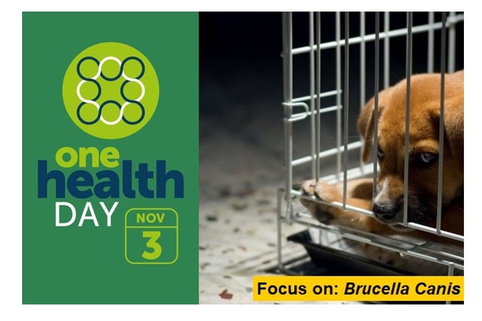 One health day, 3 Nov. Focus on: Brucella Canis. A puppy in a crate with its nose and paw poking through the bars.