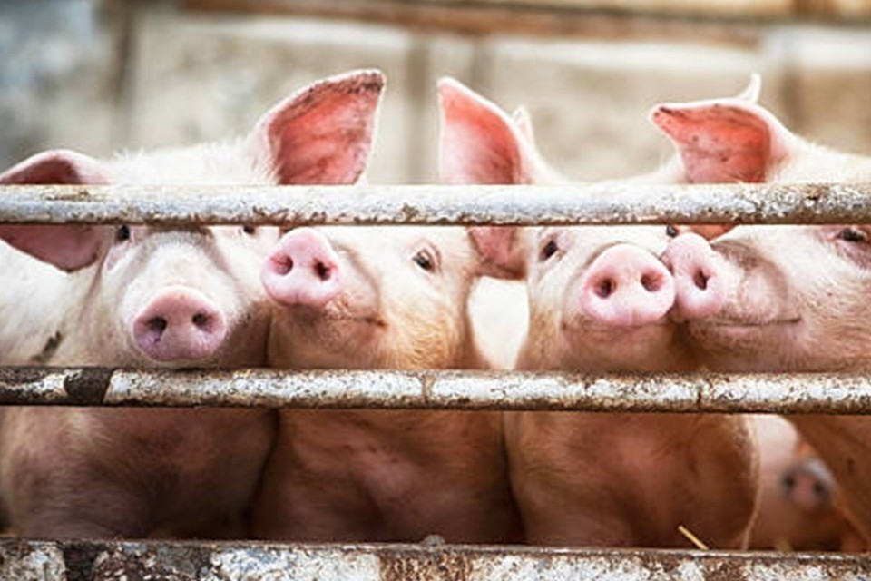 Four pigs standing together with their snouts poking through the metal rails of their pen.