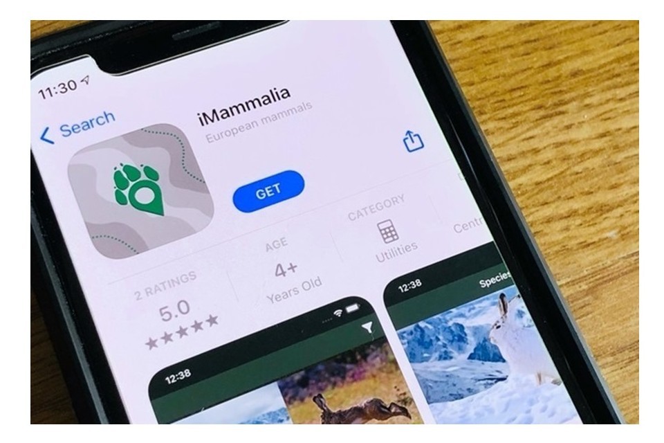 A phone screen shows the iMammalia app on an app store. It shows its paw print logo and screenshots of the app.