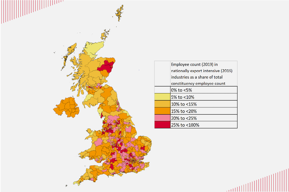 Sources: ONS BRES (2019), NISRA BRES (2019), ONS UK Input-Output Analytical Tables (2016), DIT Calculations. Notes: The proportion of employees (2019 BRES ONS and NISRA) in each constituency that work in ‘export intensive sectors’ – defined as the top quartile of UK sectors that have the highest share of exports as a share of total domestic output at the national level (according to 2016 ONS input-output data). This calculation does not account for within sector and across constituency differences in export intensity and so does not tell us how export intensive or how many jobs are supported by exports at the constituency level. See DIT (2021) ‘Local jobs, trade and investment’, for caveats and data coverage. Estimates for Northern Ireland are for Northern Ireland as a whole and agriculture is excluded. ↩