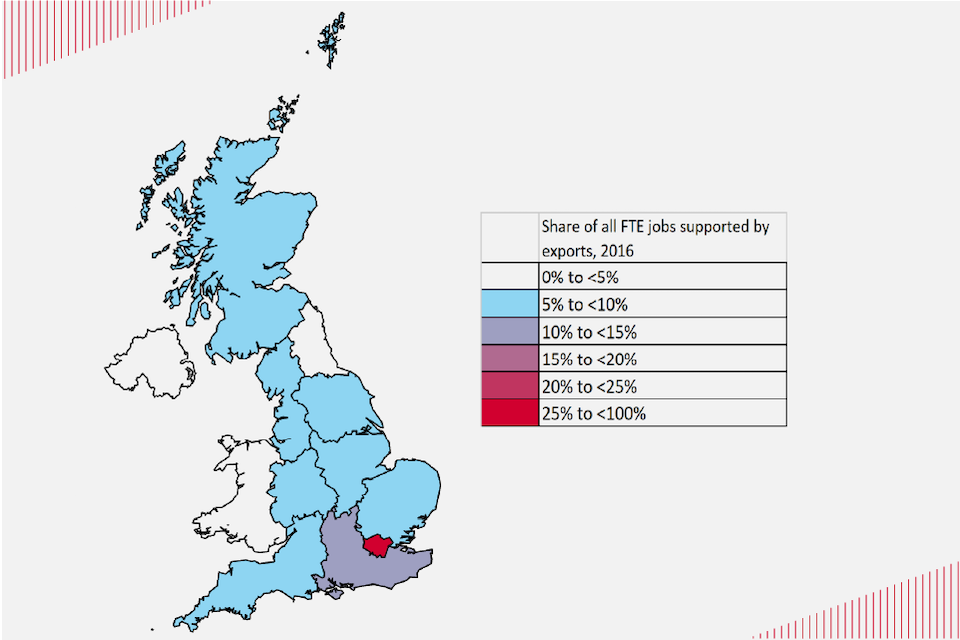 Exports supported 6.5 million jobs across the UK’s regions in 2016, of which 74% are outside London and the majority (57%) were supported by exports to non-EU countries.
