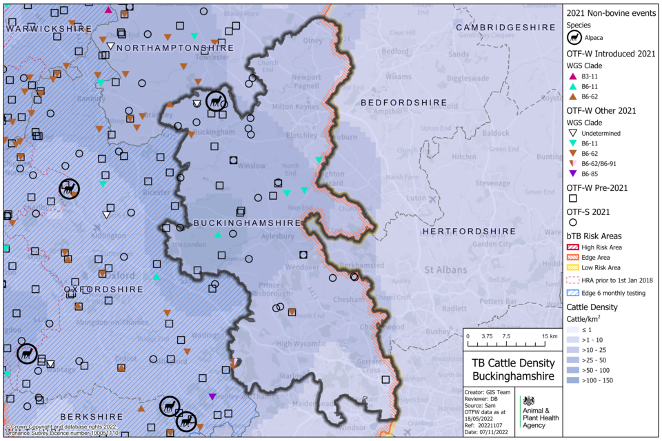 The only bacteriologically confirmed incident of M. bovis infection in a non-bovine species was in an alpaca herd in the north-west of the county bordering Northamptonshire, which is also in the Edge Area. Whole Genome Sequence (WGS) clade of B6-62 (genotype 10:j) of M. bovis was isolated from visible lesions of TB found at post-mortem, in removed alpacas. This is likely to be part of a cluster of TB incidents in cattle where local spread appears to have occurred. This incident remained unresolved at the end of 2021.