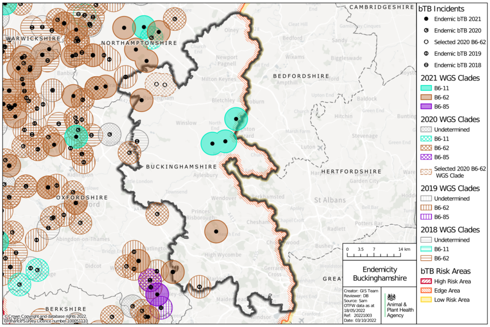 Badgers were an equally important driver of the TB epidemic in Buckinghamshire in 2021, contributing to 41% of risk pathways. Figure 8 shows 67% (4 out of 6) of new OTF-W incidents yielded WGS clade B6-11 (one genotype 17:a and 3 17:b) of M. bovis. This may be an indication of endemic TB infection within the local wildlife population, especially in the east area of the county where a cluster of 3 incidents with WGS clade B6-11 was disclosed.