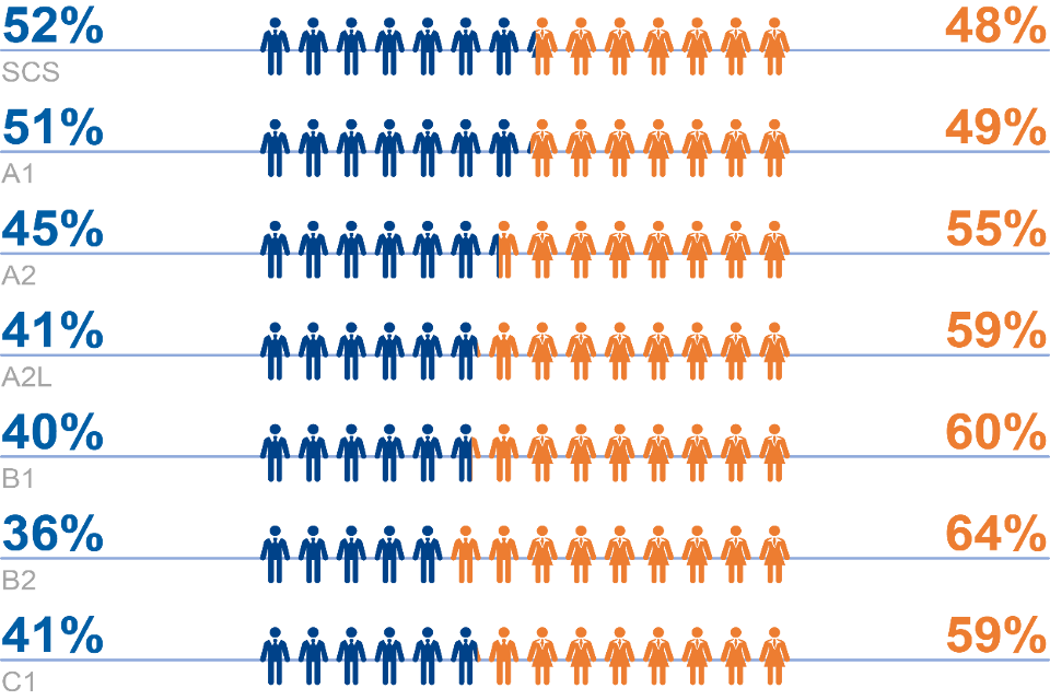 As in previous years, DFID continues to have a high proportion of its roles in more senior managerial grades (SCS – A2). Women are represented at these grades at a lower proportion than the overall proportion of women in DFID.
