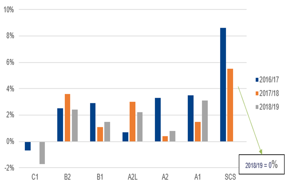 The mean gender pay gap in SCS grade has decreased significantly from 8.6% in 2016/17 and is now sitting at 0%. Within other pay grades it has fluctuated across years, however only grade A2L remains higher than 2016/17 level.