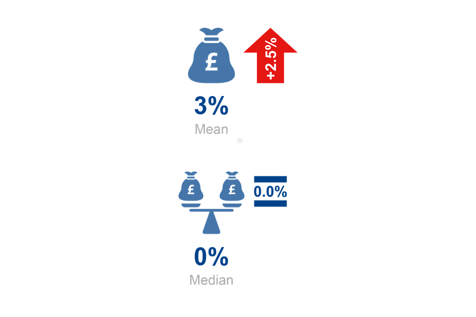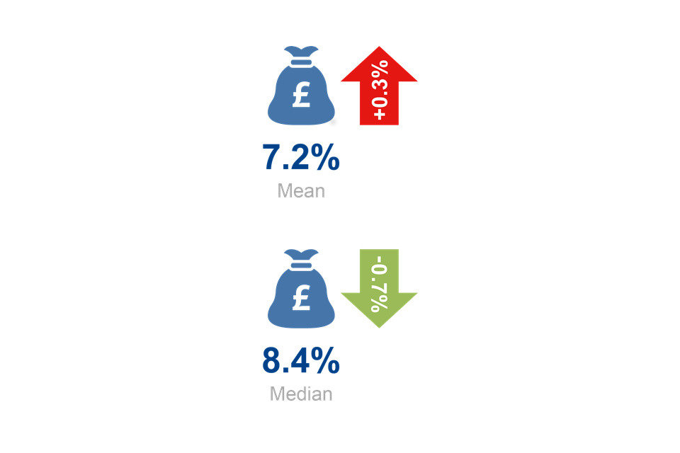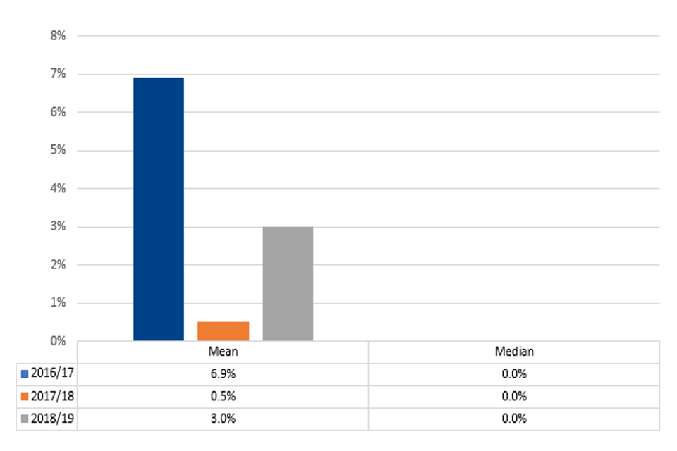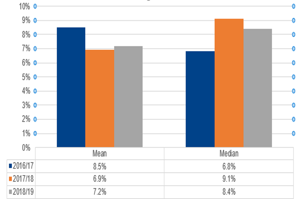 The mean pay gap has increased by 0.3 percentage points between 2017/18 and 2018/19. However, the median pay gap has decreased by 0.7 percentage points from 2017/18, to 8.4%. The salary for the median female has decreased from 2017/18, however the salary for the median male has also reduced.