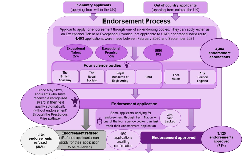 For most applicants, the Global Talent application process involves two stages: endorsement and visa application. Most applicants apply for endorsement either as an Exceptional Talent or someone showing Exceptional Promise in their field. [footnote 6] Figure 1.1 below outlines the application process and includes a breakdown of volumes between 1 January 2020 and 5 August 2021.