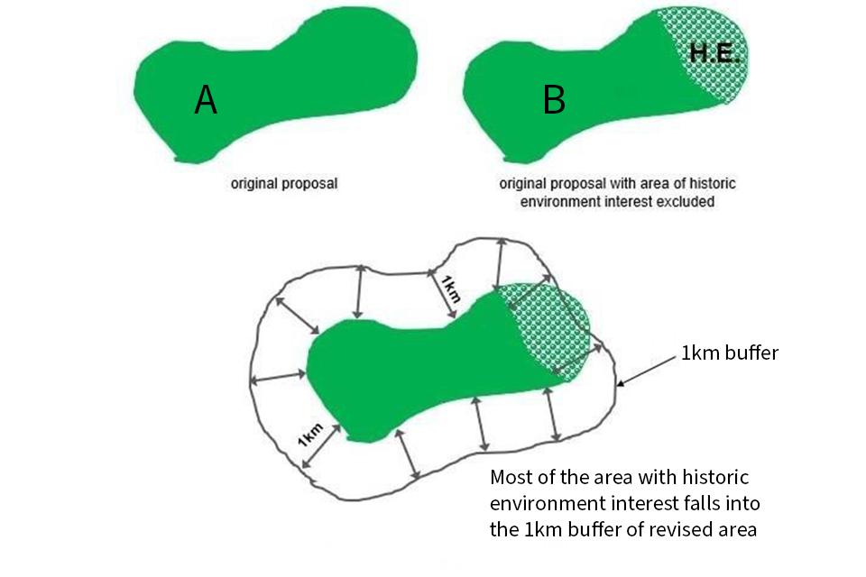 Step 2: defining a 1km buffer: area 'A' shows the original proposal. Area 'B' shows original proposal with area of historic environment interest excluded. Most of the area with historic environment interest falls into the 1km buffer of revised area