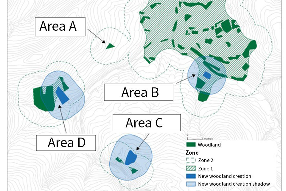 Area C: New woodland creation in zone 2 is within 500m of open land and will result in additional shadow encroachment onto open land.