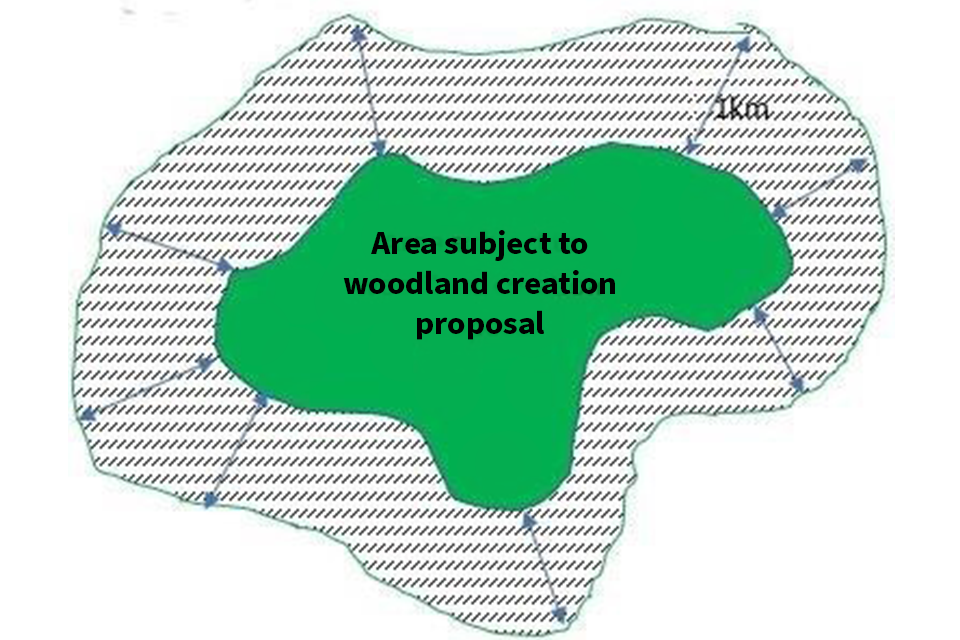 How to create 1km buffers: the diagram shows the woodland creation proposal area surrounded by a 1km buffer