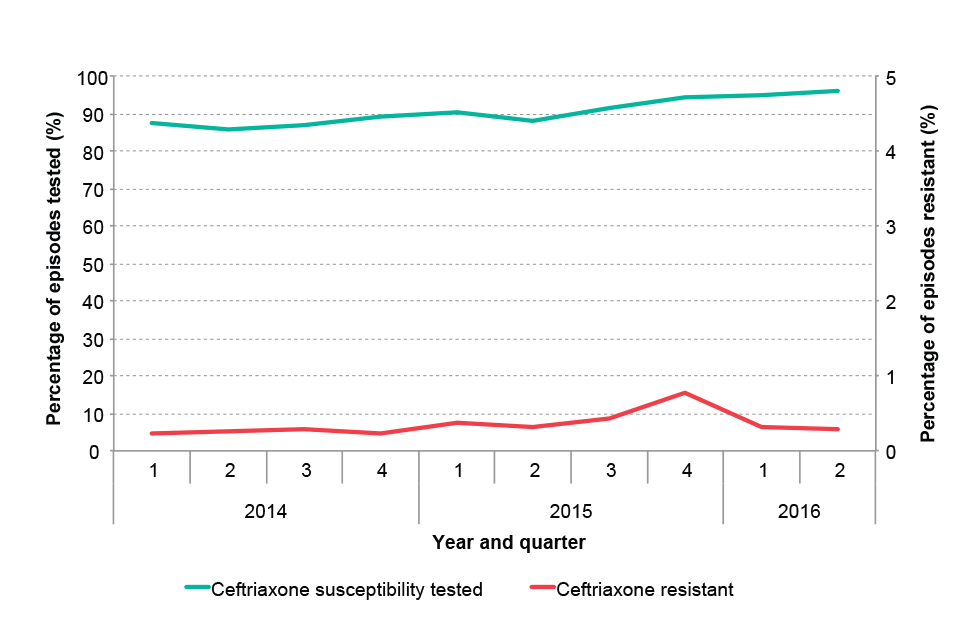 Figure 2. Percentage of gonococcal isolates tested for ceftriaxone susceptibility and reported as resistant by primary diagnostic labs in England by quarter: 2014 to June 2016