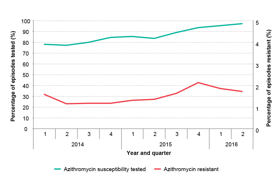 Figure 1. Percentage of gonococcal isolates tested for azithromycin susceptibility and reported as resistant by primary diagnostic labs in England by quarter: 2014 to June 2016