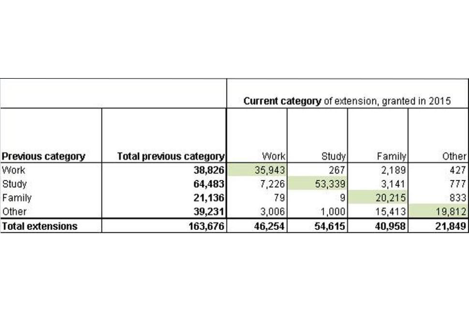 Of the 163,676 extensions granted in 2015 to main applicants, 129,309 (79%) allowed the individual to stay within their original broad category, with the other 21% having switched categories.