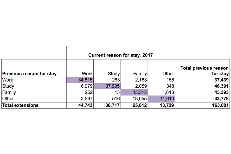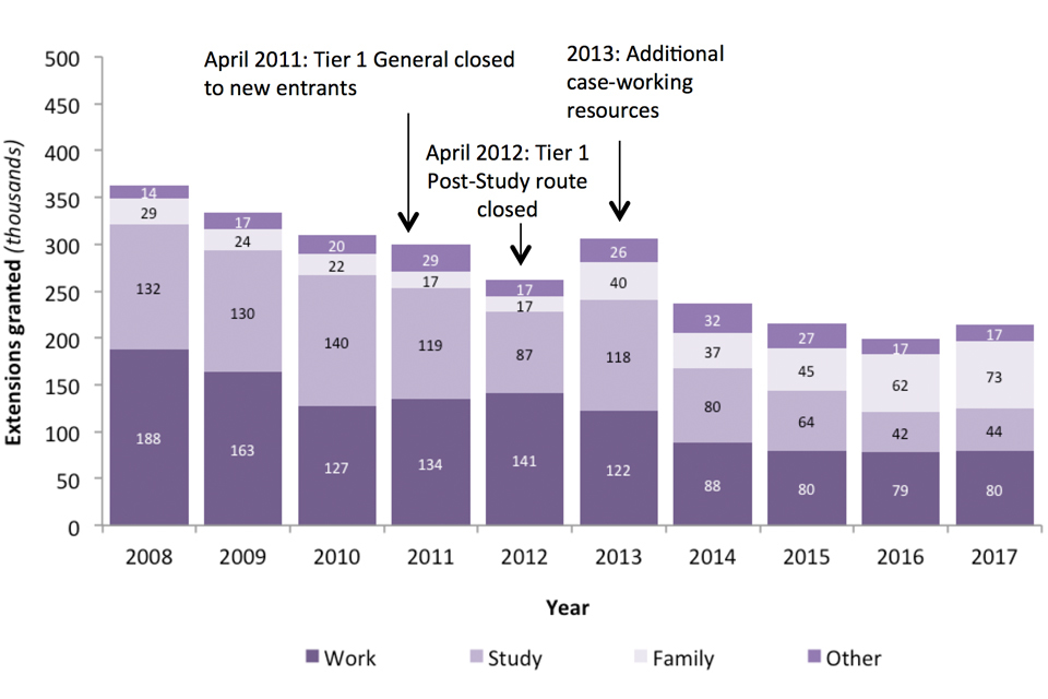 Of the 163,001 extensions granted in 2017, 127,845 (78%) allowed the individual to stay within their original broad reason for stay, with the other 22% having switched categories, which is similar to recent years. By comparison, in 2011 and 2012 a higher proportion switched (29% and 30% respectively). The fall in the proportion who switched largely reflects the closure of the Post-study route. Further details can be found in the user guide.