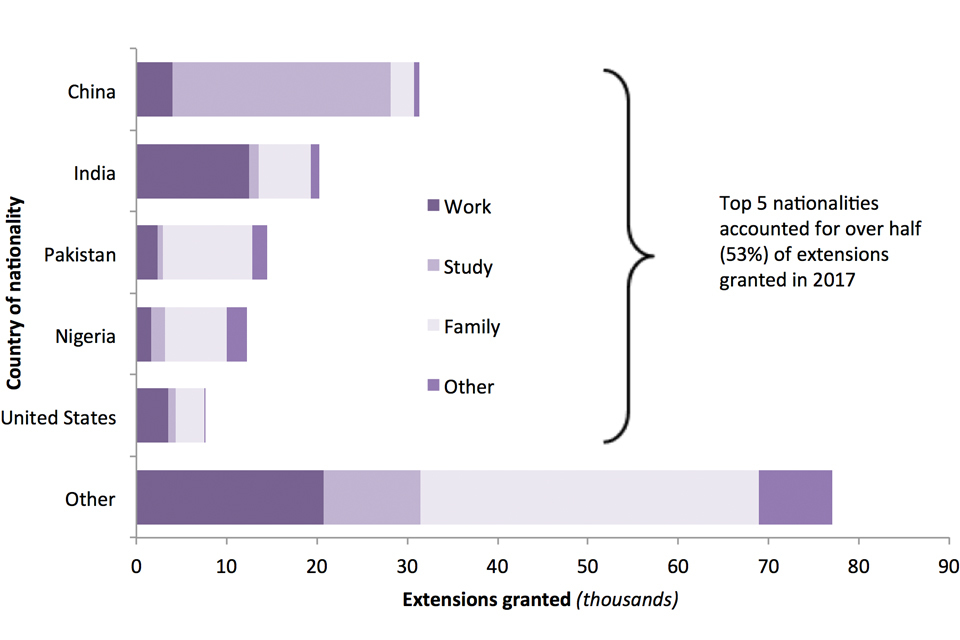 The top 5 nationalities account for over half of all extensions. For the largest group, Chinese nationals, 77% of extensions are for study. For the second largest nationality, Indian nationals, a majority (62%) are for work and a further 29% are extensions for family reasons. For the next 2 largest nationalities, Pakistan and Nigeria, extensions for family reasons tend to dominate, accounting for 69% and 56% respectively.