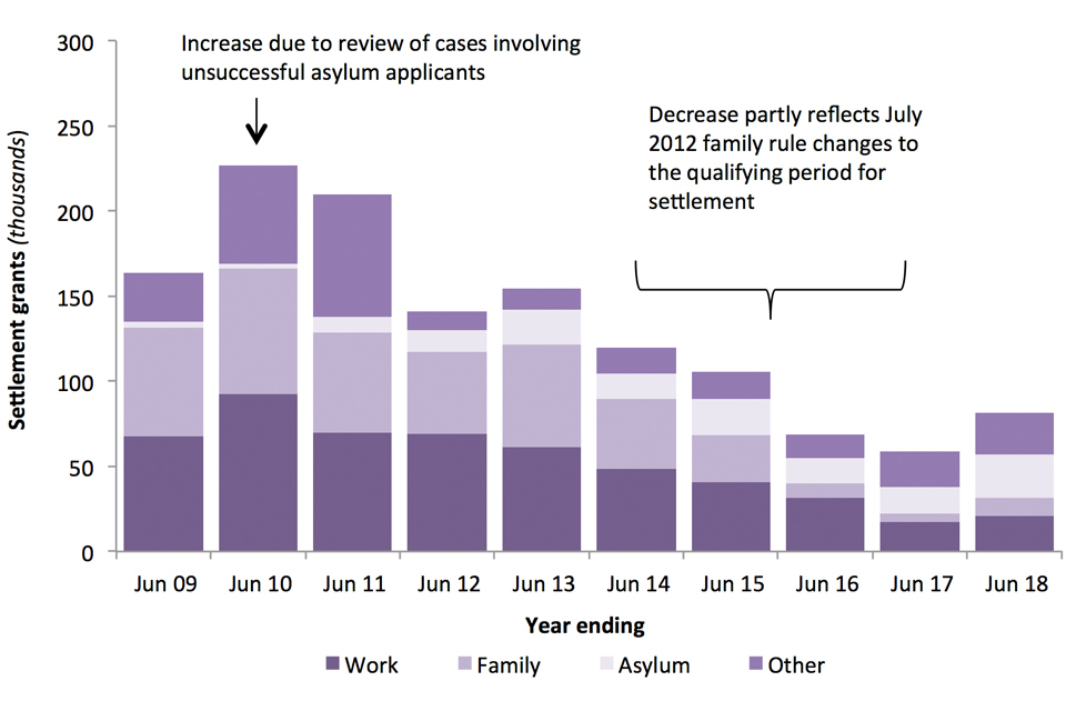 - Settlement granted to those who have previously been granted leave to stay following an asylum claim (up 64% to 25,375). Asylum was the largest category of settlement grants in the year ending June 2018, accounting for 31%