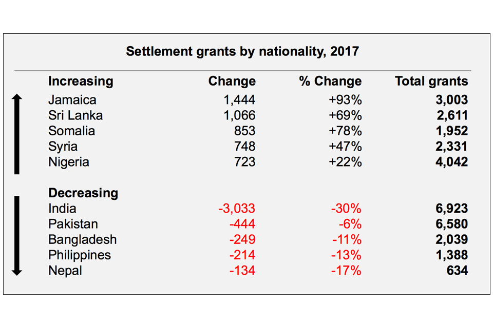 Of the total 65,102 grants of settlement in 2017, 29% (18,818) were to nationals of South Asian countries and a quarter (16,011) were to nationals of Sub-Saharan African countries.