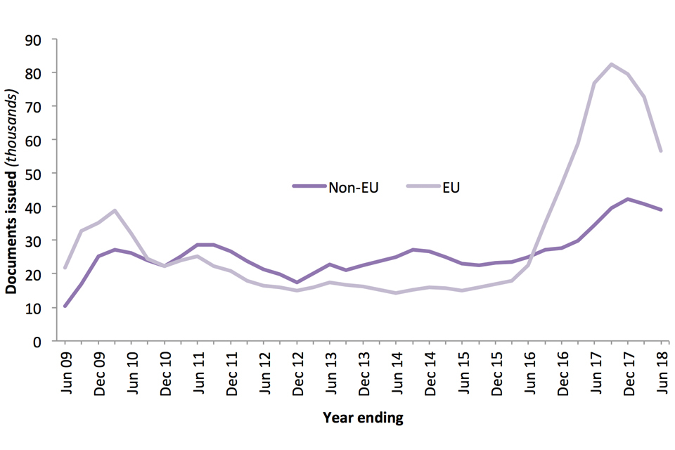 There were 116,323 documents certifying permanent residence and permanent residence cards issued in the year ending June 2018. The majority of these (85%) were issued to EU nationals. This is down from a peak in the year ending December 2017, following the EU referendum, when 168,413 documents were issued.
