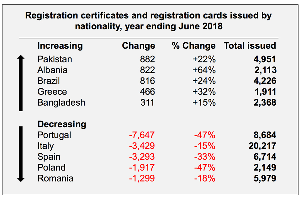 In the year ending June 2018, there were 95,580 registration certificates and registration cards issued, 14% less than the previous year (111,192). The fall is attributed to EU nationals (down 20,197 to 56,536), while registration documents issued to non-EU nationals increased (up 4,585 to 39,044).