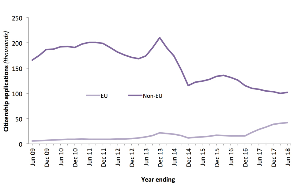 Applications for British citizenship, EU and non-EU nationals1, year ending June 2009 to the year ending June 2018