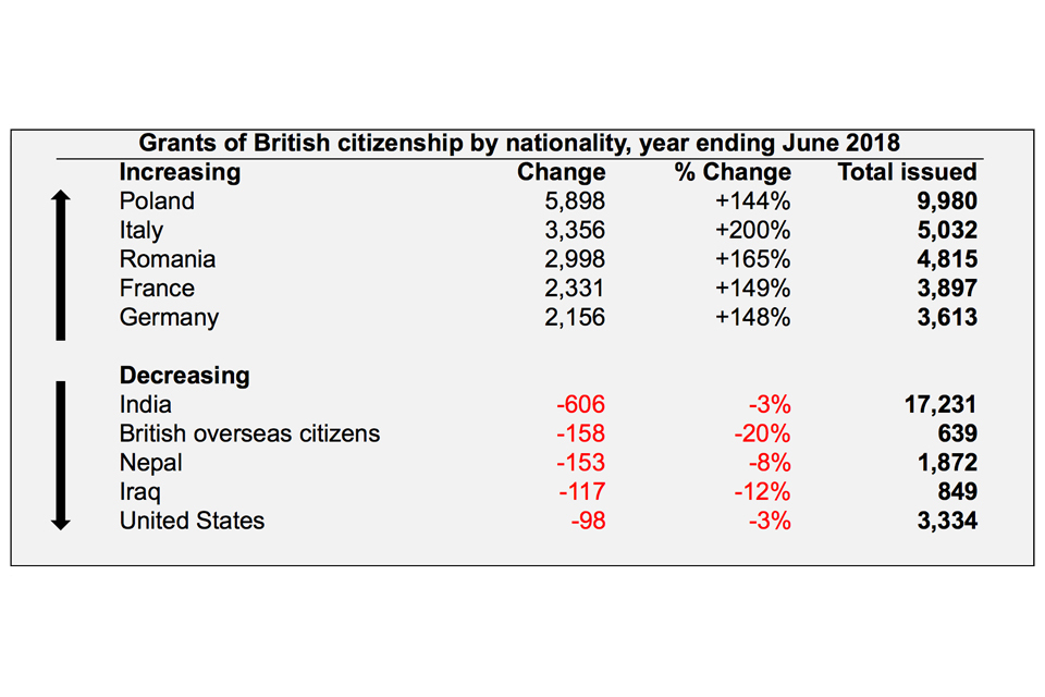 There were 150,729 grants of British citizenship in the year ending June 2018. The former nationalities that were granted the highest numbers were: