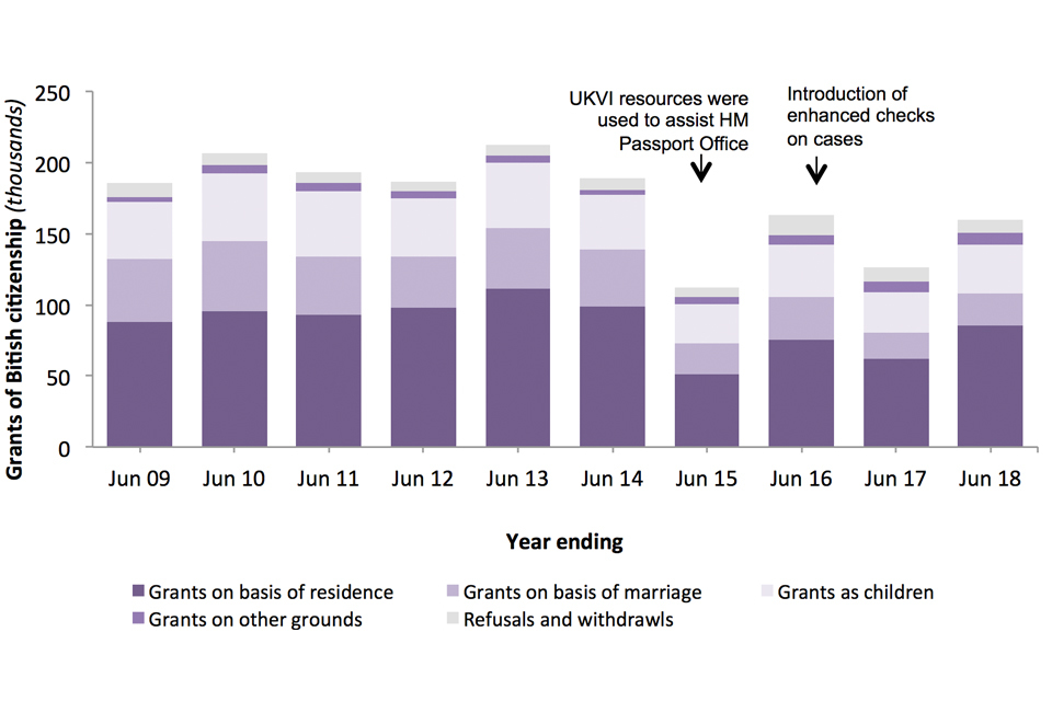 Former Indian and Pakistani nationals had the highest numbers of citizenship grants in most years from 1998 to 2018 – and together accounted for 20% of grants in the year ending June 2018.