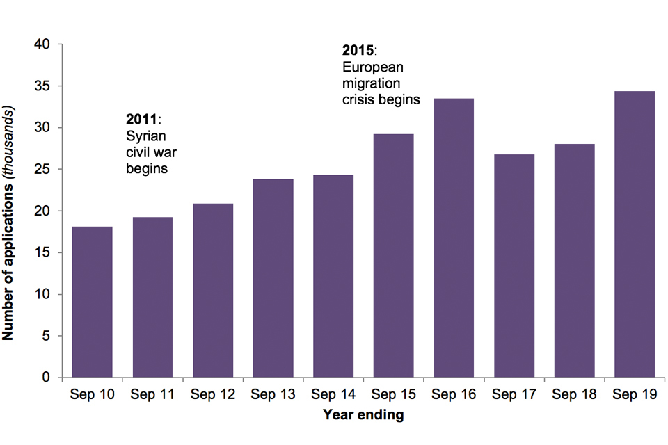 There were 34,354 asylum applications in the UK (main applicants only) in the year ending September 2019, 22% more than the previous year and the highest level since the year ending June 2016, around the time of the European migration crisis. UASCs accounted for 10% of total asylum applications in the latest year.