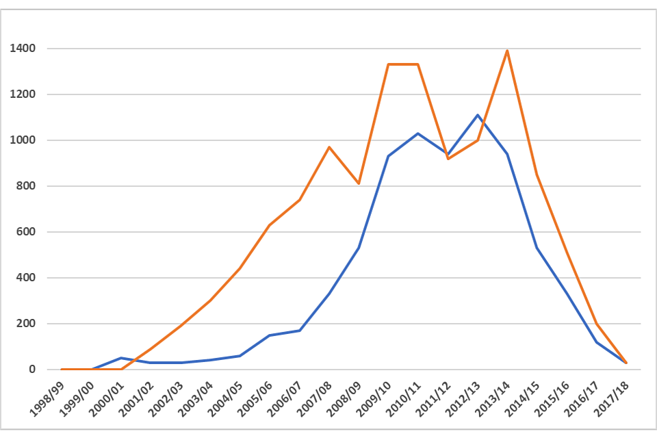 The 8,000 settlements relate to around 19,000 usages of DR schemes. A breakdown of this across years for employers and individuals is shown in Chart below: