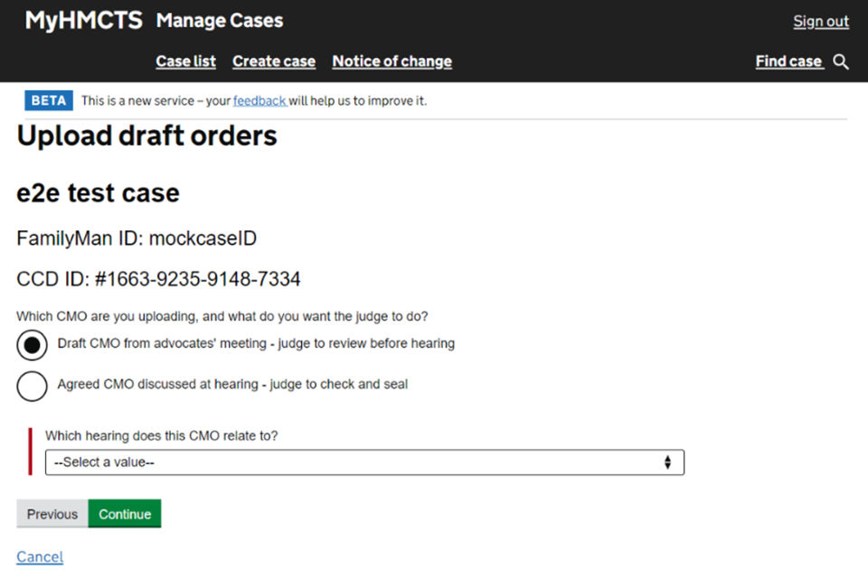 3. Select the draft CMO option, then choose which hearing the CMO relates to from the dropdown menu.