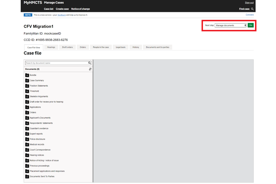 1. Open the case and select ‘Manage documents’ from the next step dropdown menu. Then select ‘Go’.