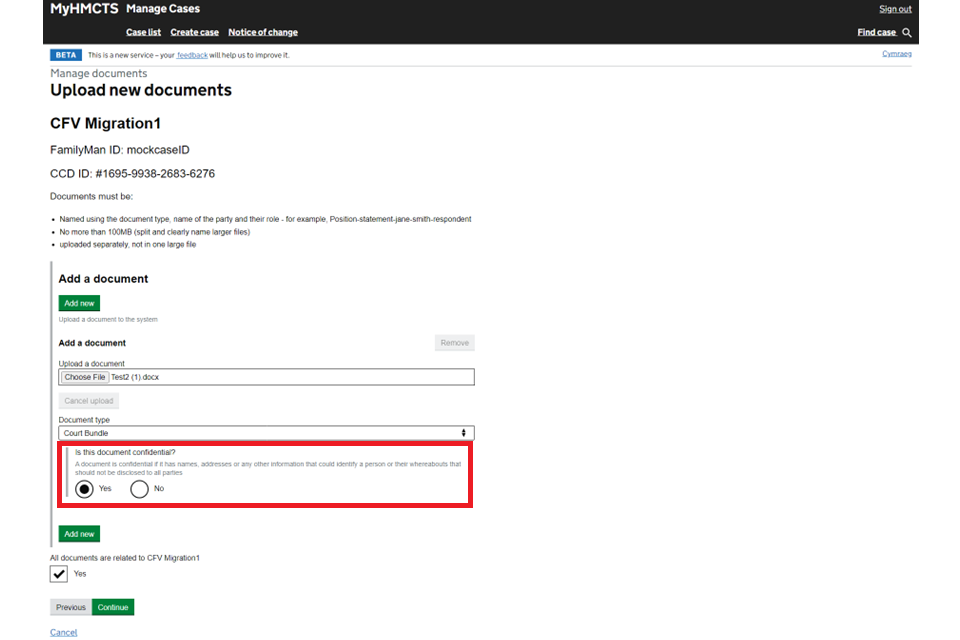 4. Select ‘Yes’ if the documents are confidential and must be restricted to the local authority, Cafcass and HMCTS.