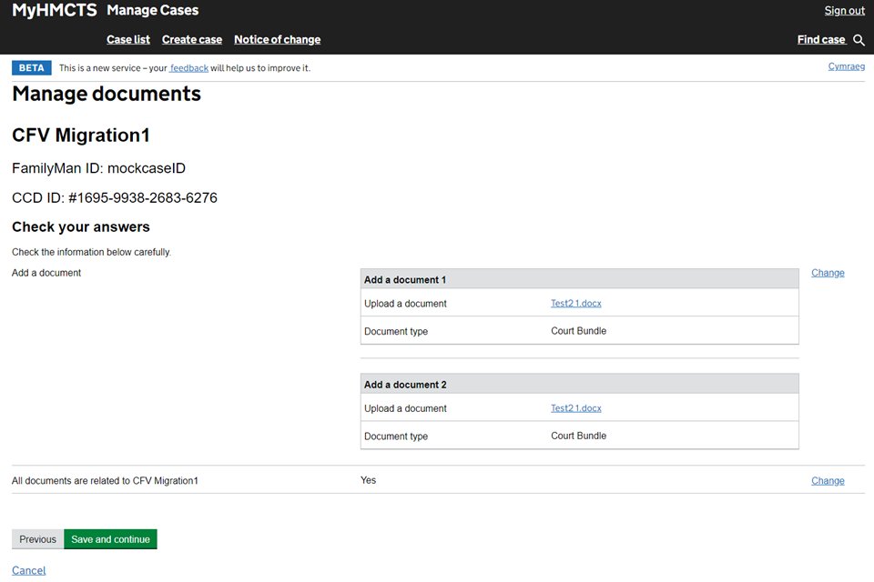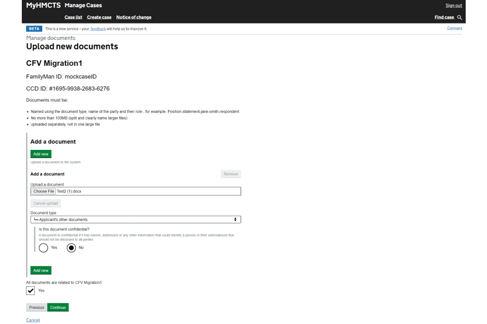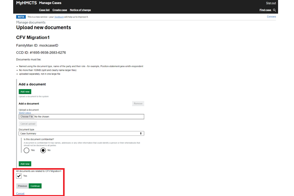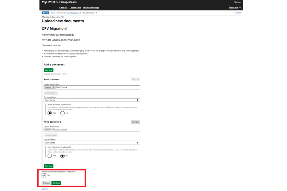 6. When you’ve added everything, check all documents are related to this case and tick ‘Yes’. Then select ‘Continue’.